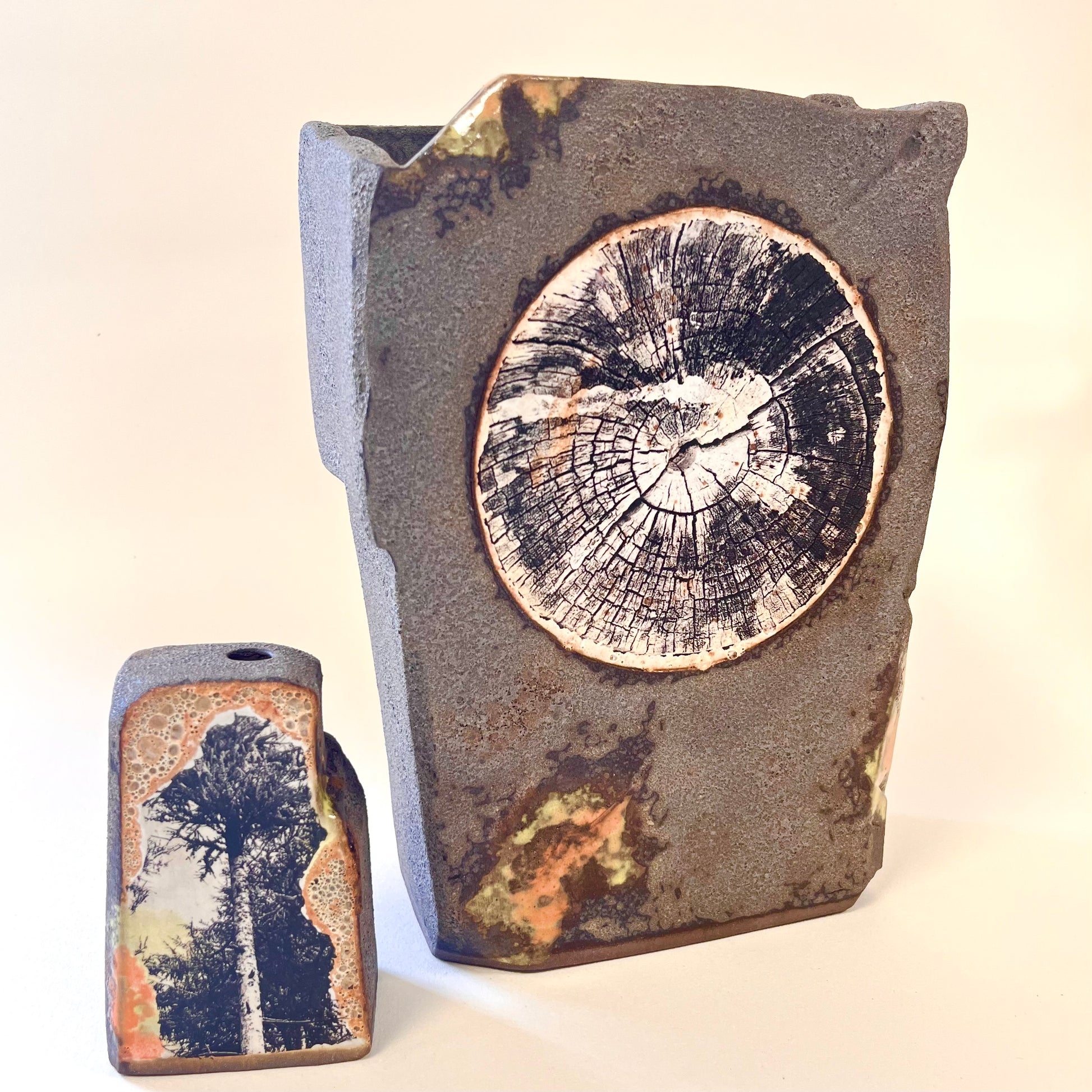 Large sculptural stoneware vase with a digital transfer of a tree ring at Langamull on the North West coast of Mull.