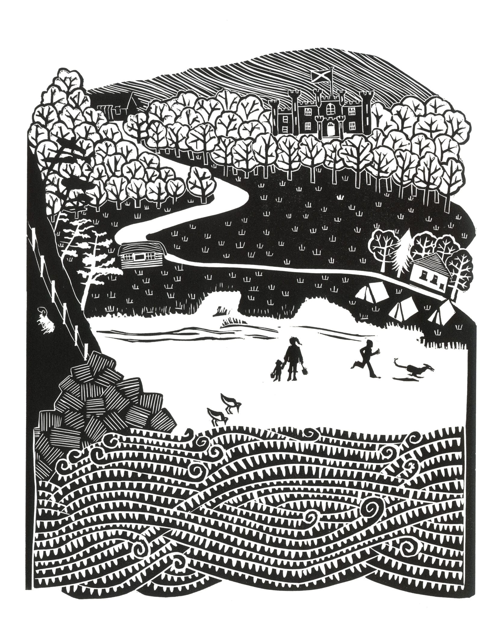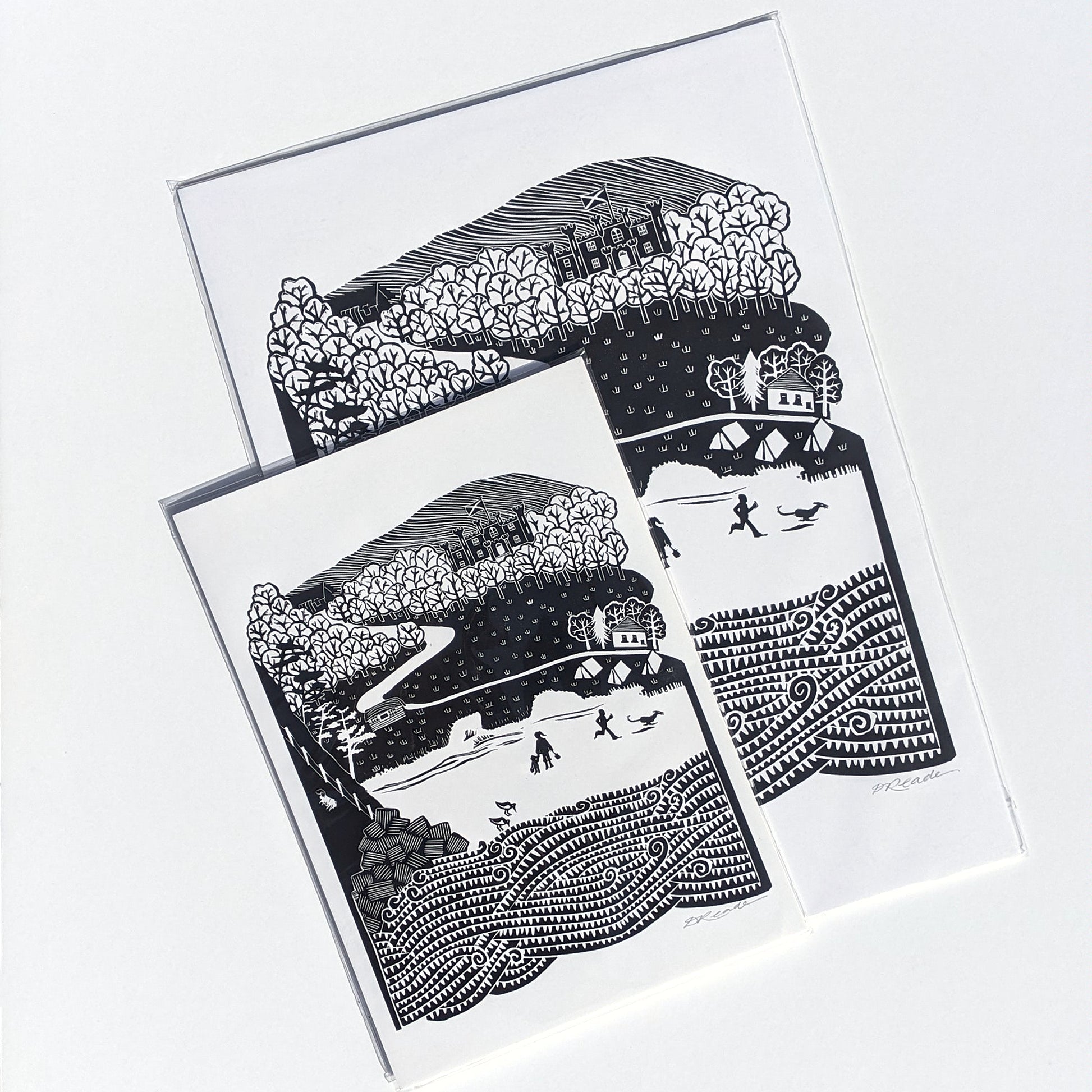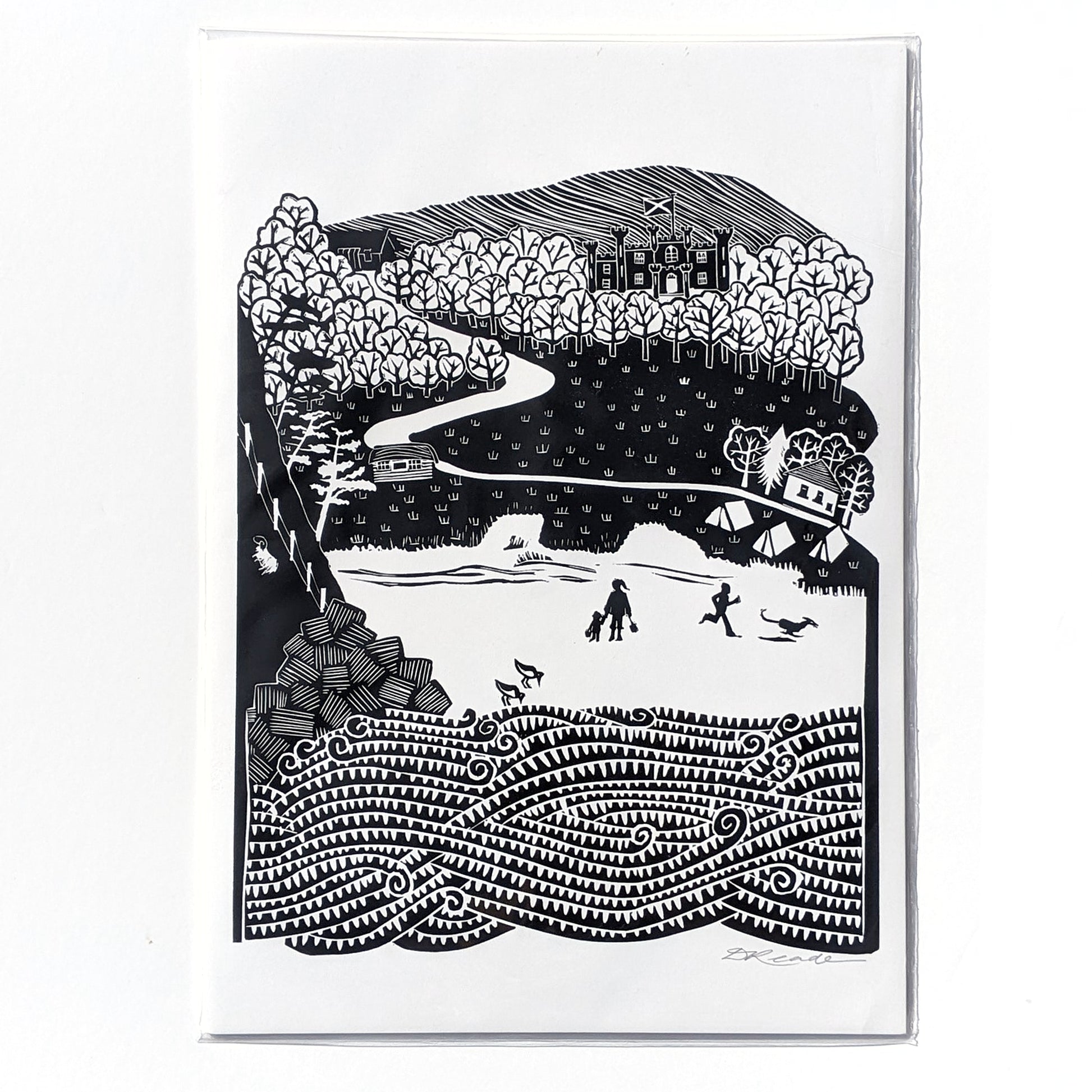 Unframed and unmounted, open edition digital print from an original linocut of Calgary Bay, on the North West Coast of Mull.