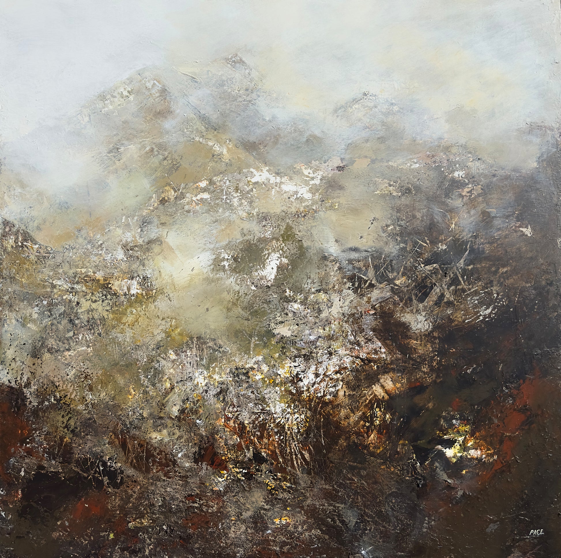 The rugged, rocky lower slopes, strewn with stumbling stones and dried bracken, contrast with the soft, silken sweep of mist that envelops the receding upper mountain shapes.