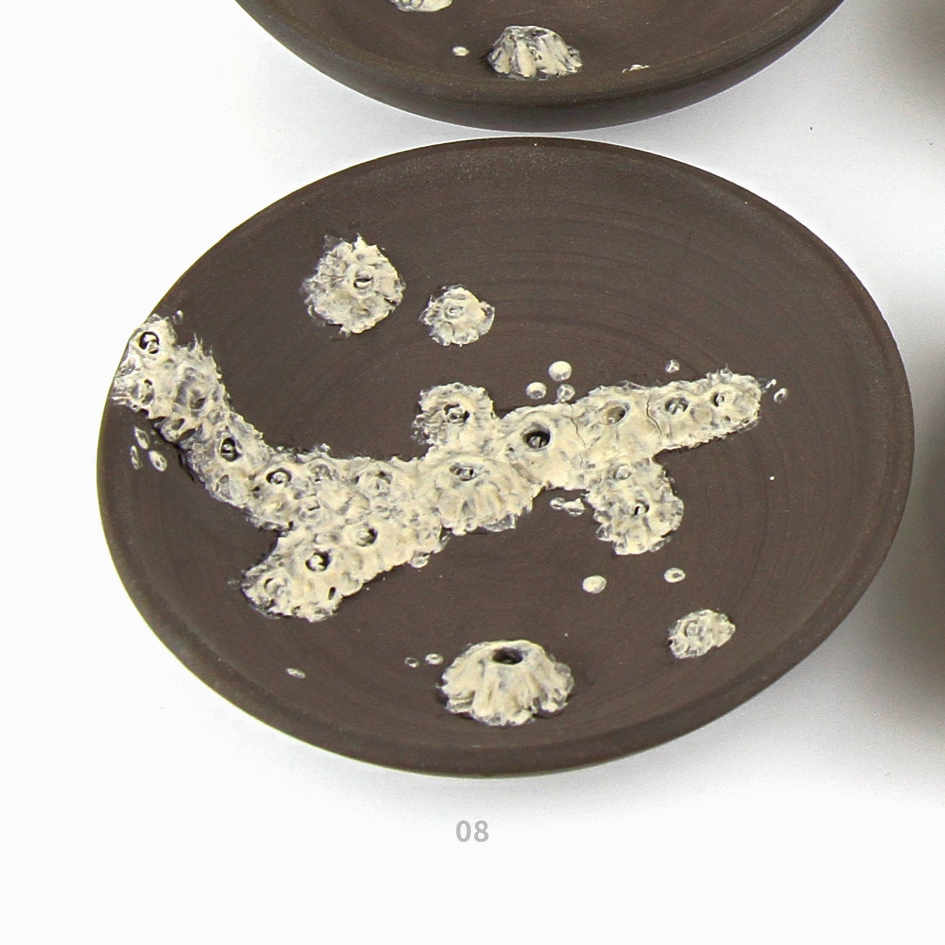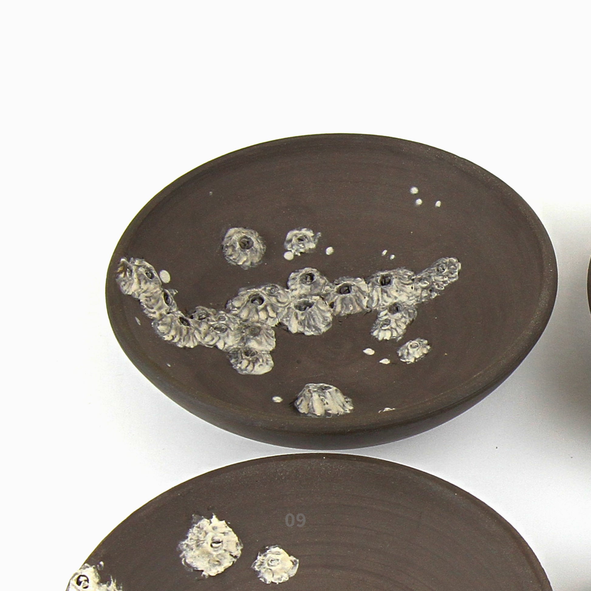 Black stoneware wheel-thrown dish with individually modelled barnacles in white slip.