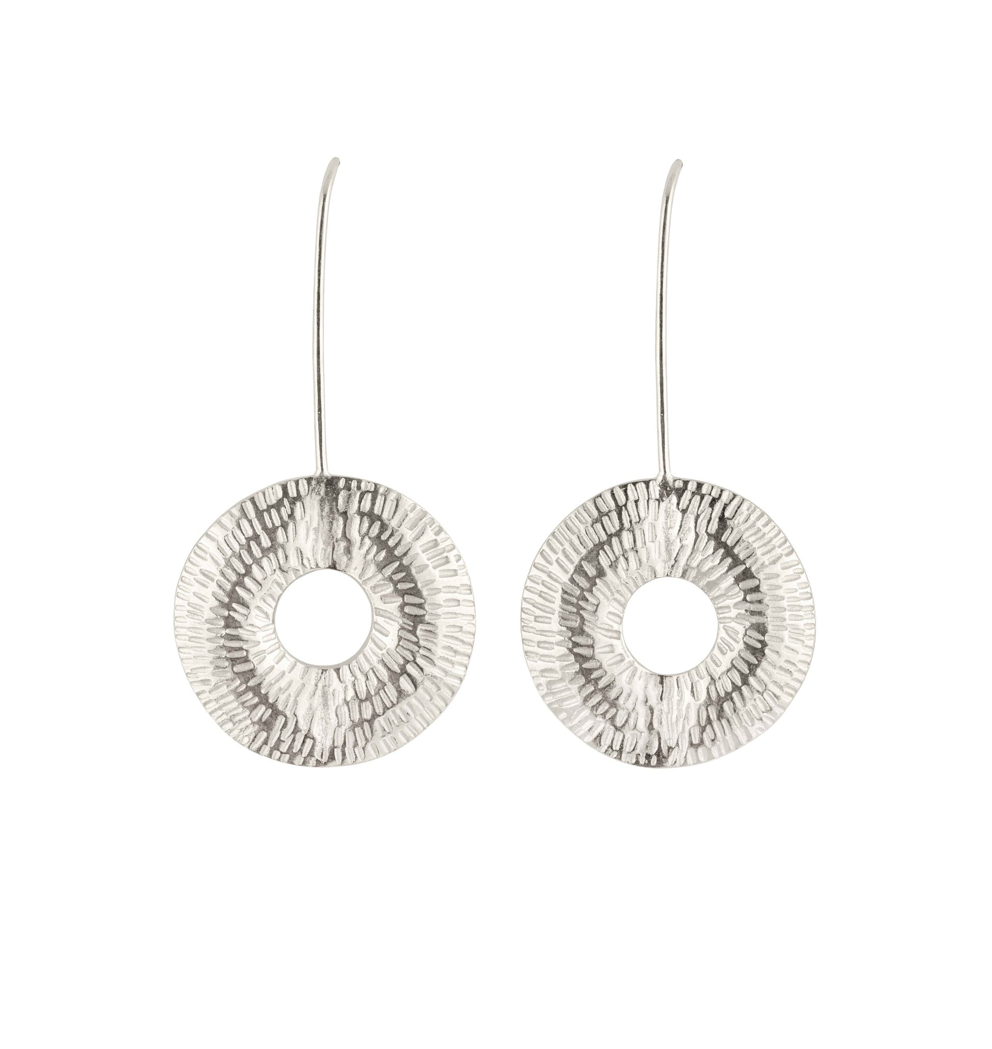 Timeless elegant silver drop earrings available with the finish of your choice. These circular earrings are beautifully lightweight and make the perfect accompaniment to your favourite outfit. Handmade by Caitlin in Scotland, the form is influenced by ancient stone circles. The surface is uniquely textured using Caitlin’s hand forged tools.